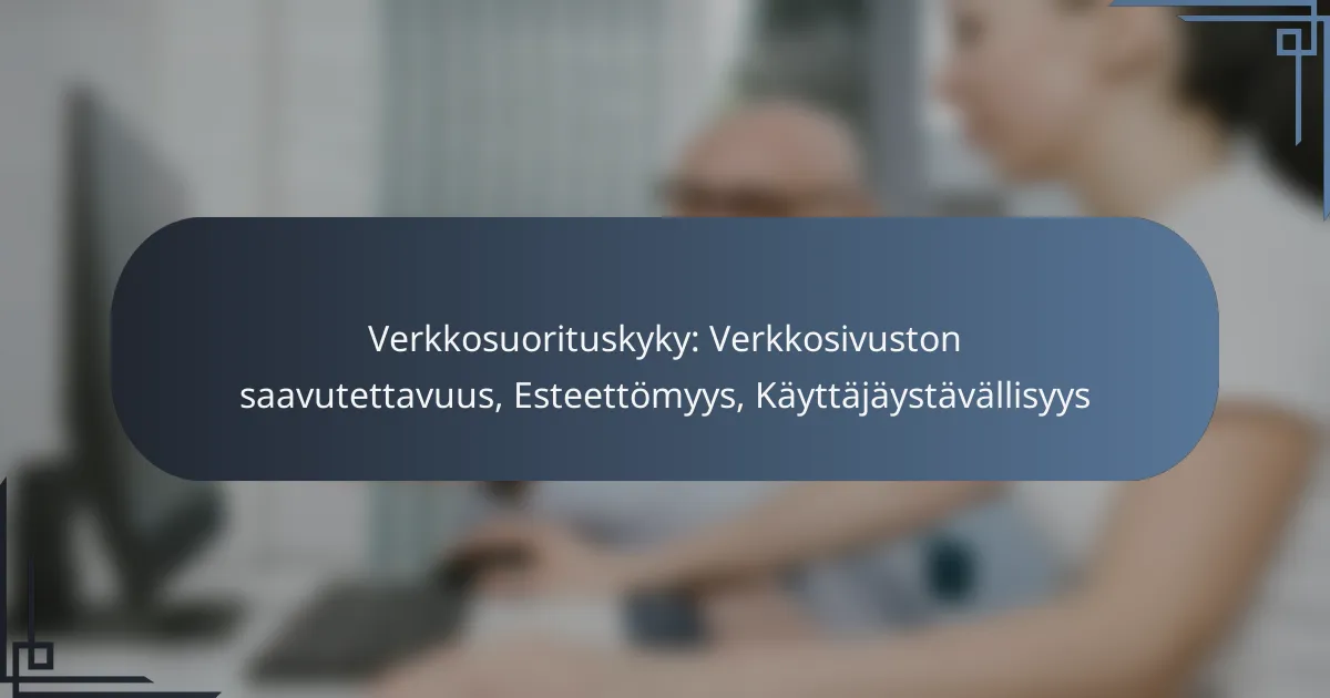 Verkkosuorituskyky ja esteettömyys ovat keskeisiä tekijöitä käyttäjäkokemuksessa. Verkkosuorituskyky viittaa siihen, kuinka nopeasti ja tehokkaasti verkkosivusto toimii, kun taas esteettömyys tarkoittaa, kuinka hyvin kaikki käyttäjät, mukaan lukien vammaiset, voivat käyttää verkkosivustoa.